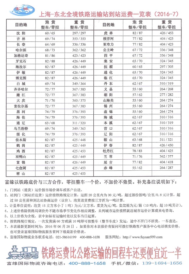 | 上海-东北主要城市铁路运输运费参考表(2016) |